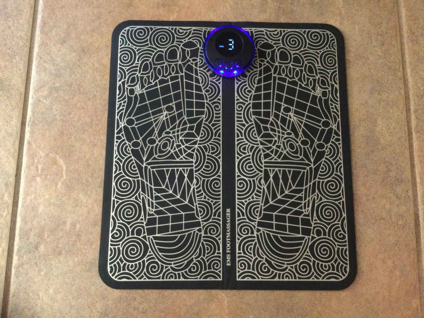 STEP 2: Place both feet on the mat, press the "+" or "-" button to turn on the device, and adjust the intensity. Press "M" to switch modes. You can adjust controls from the remote as well.